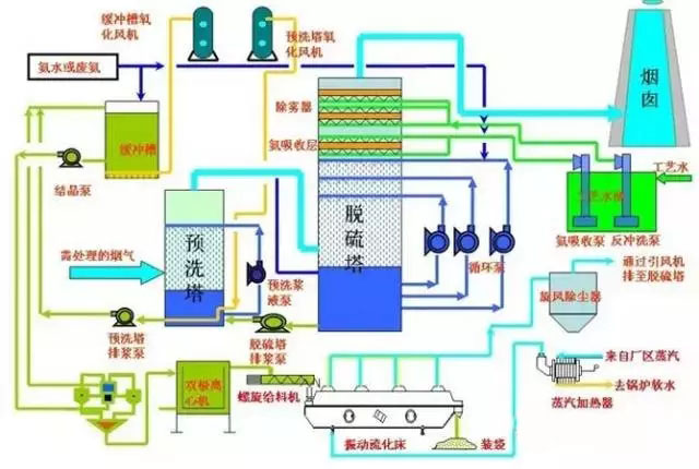 該工藝主要由脫硫洗滌系統(tǒng)、濃縮系統(tǒng)、煙氣系統(tǒng)、氨貯存系統(tǒng)、硫酸銨生產(chǎn)系統(tǒng)(若非氨-硫銨法則是于其工藝相對應(yīng)的副產(chǎn)物制造系統(tǒng))、電氣自動控制系統(tǒng)等組成。