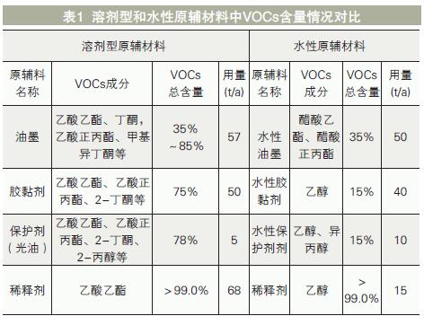 某薄膜印刷企業分別采用溶劑型和水性原輔材料生產同一產品的情況下,VOCs的成分及含量對比情況見表1。該企業改用水性材料后,VOCs產生量減少了約80%??梢姴捎盟栽o材料可大大減少VOCs排放種類和數量。