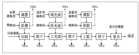 VOCs來源和排放途徑主要有:原輔材料調配;供料(油墨、光油或膠黏劑);印刷、上膠、上光油、復合等工藝過程;烘干及設備清洗等過程中溶劑的揮發,其中揮發量最大的為烘干,其次為供料過程。在供料過程中,為保證黏度要求,槽中的物料通過槽子底部的孔流入供料桶中,添加稀釋劑后再由泵打入供料槽中,因此處于不斷循環狀態。