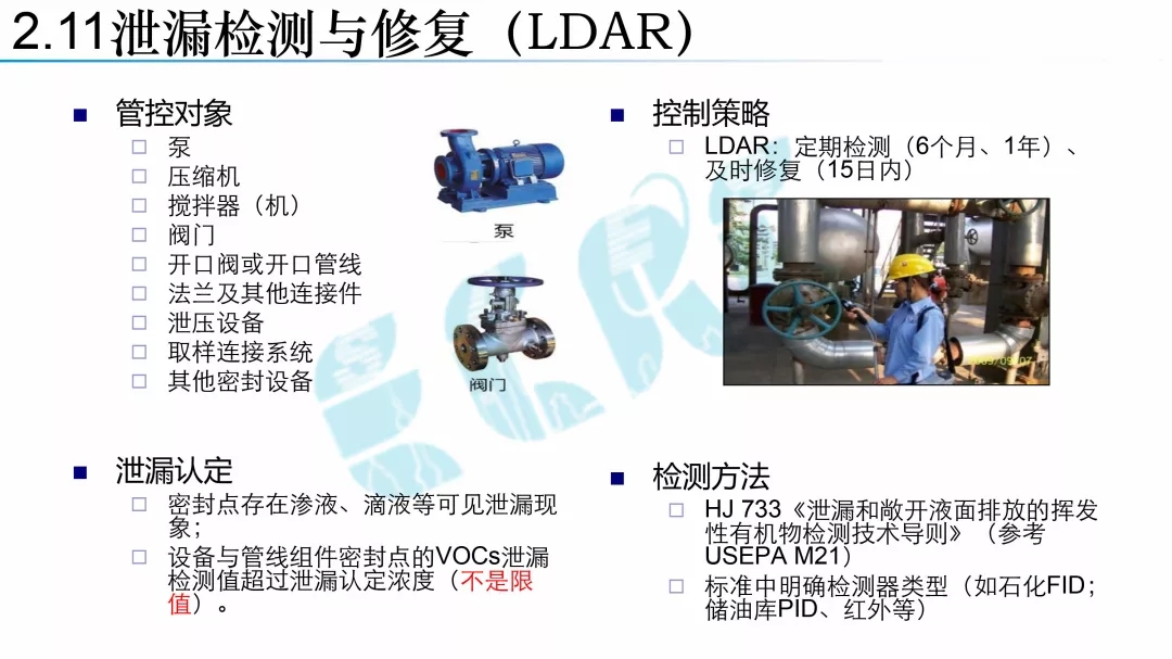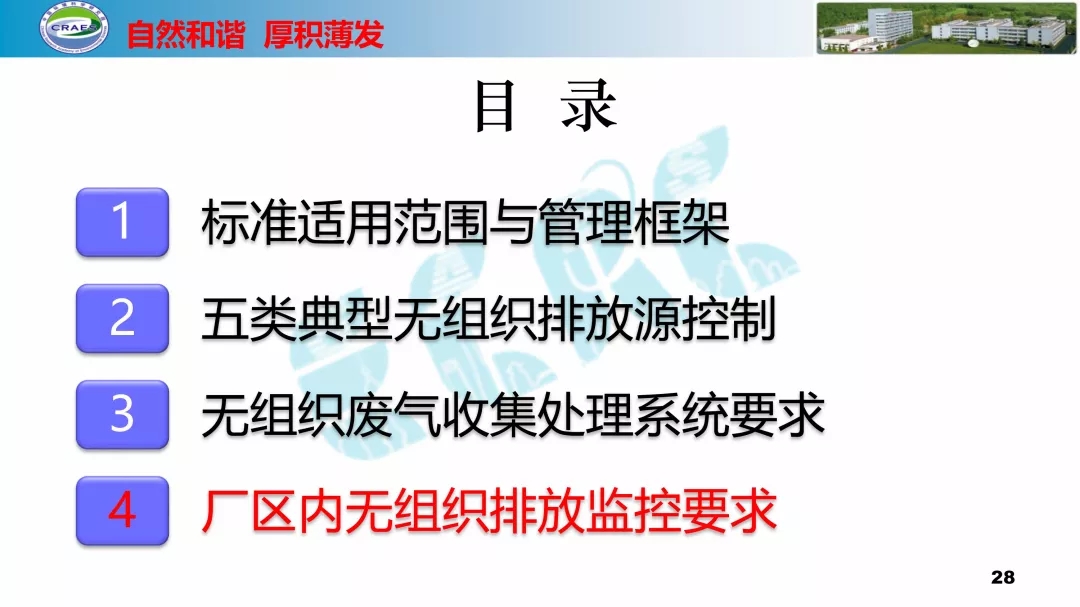 主要包括:標準適用范圍與管理框架、五類典型無組織排放源控制、無組織廢氣收集處理系統要求、廠區內無組織排放監控要求等四方面的內容。
